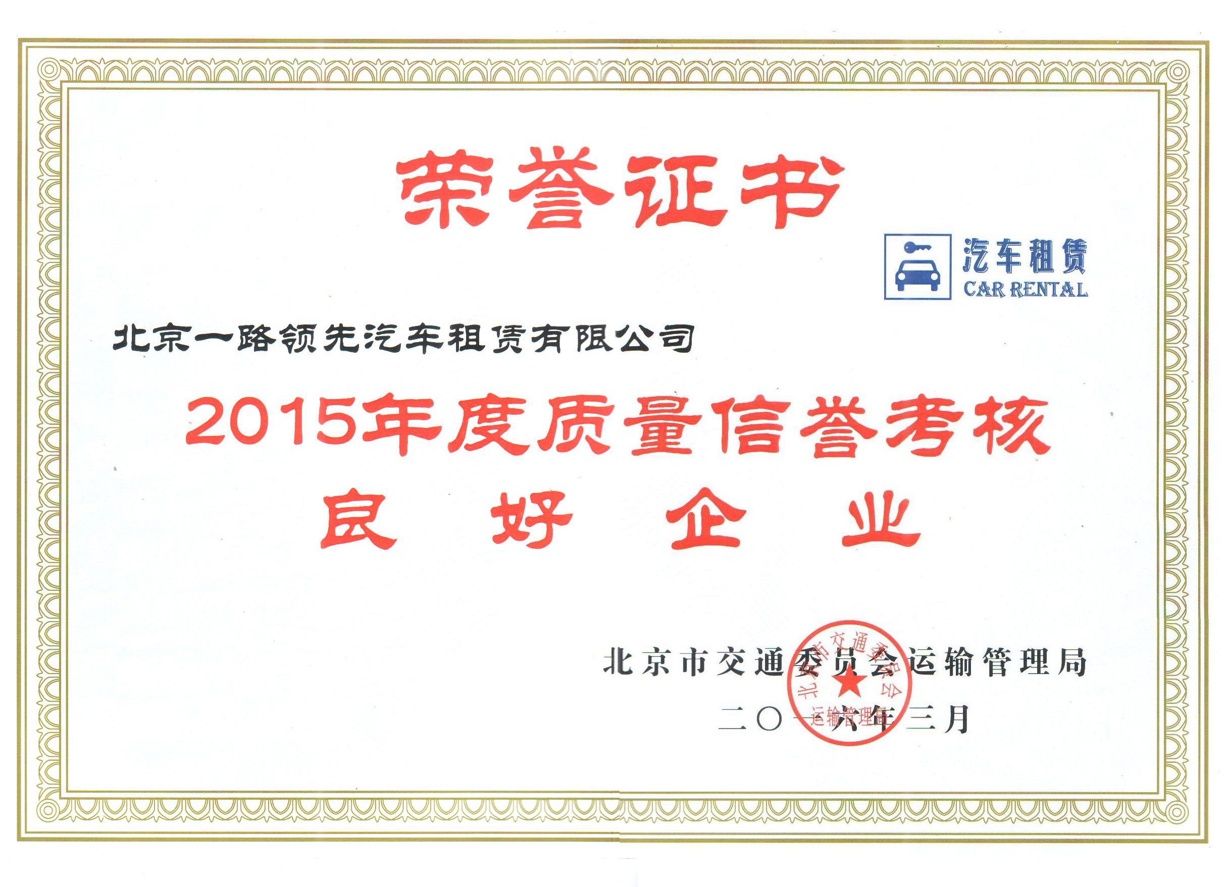 熱烈慶祝北京一路領(lǐng)先汽車租賃有限公司榮獲優(yōu)秀良好企業(yè)榮譽(yù)